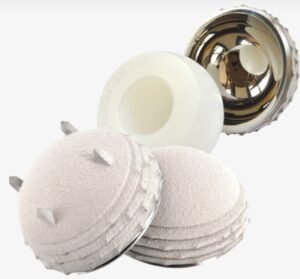 La copa metálica del sistema de doble movilidad que va incrustada en el hueso es completamente lisa en la superficie cóncava y se articula con la cabeza de polietileno.